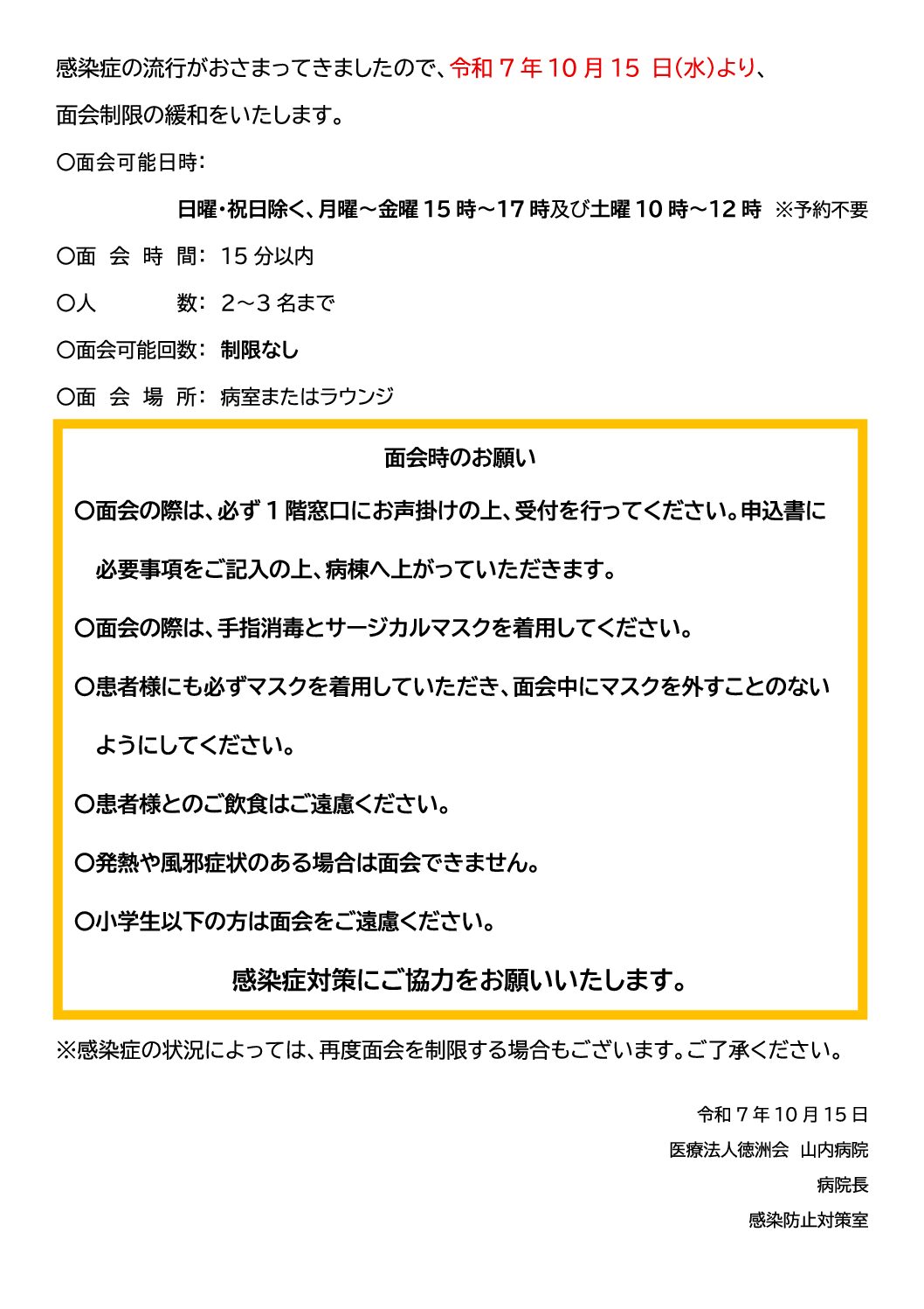 面会制限 緩和のお知らせ
